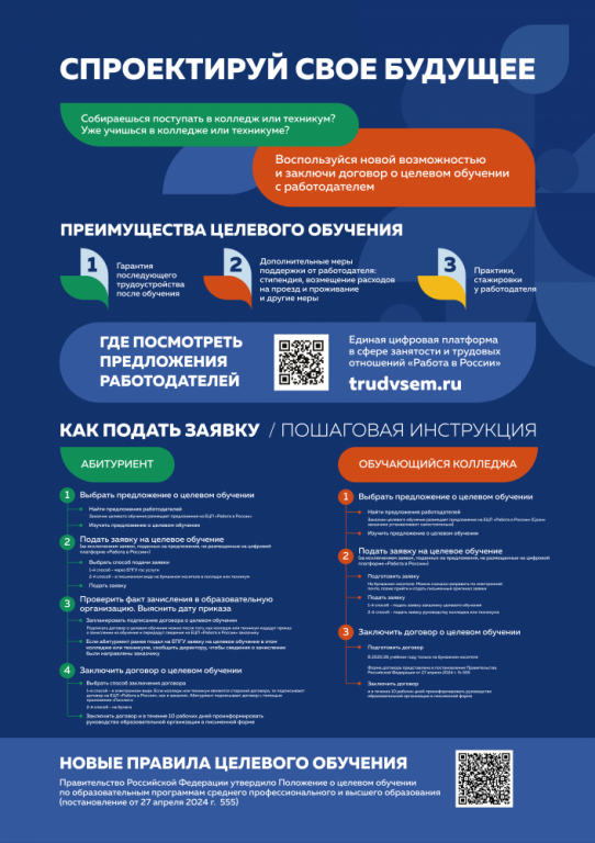 Стоимость платных образовательных услуг "Прейскурант на 2025/26 уч.год" Необходимость прохождения поступающими обязательного предварительного медицинского осмотра (обследования) ОТСУТСТВУЕТ. Всем иногородним абитуриентам (студентам) предоставляется общежитие. Если Вы еще не определились с профессией/специальностью, то предлагаем Вашему вниманию: Анонимный социологический опрос абитуриентов среднего профессионального образования (далее – СПО) и их родителей. Целью опроса является выявление мнений и взглядов будущих студентов и их родителей на систему СПО https://anketolog.ru/s/912826/Ny9rMquM |