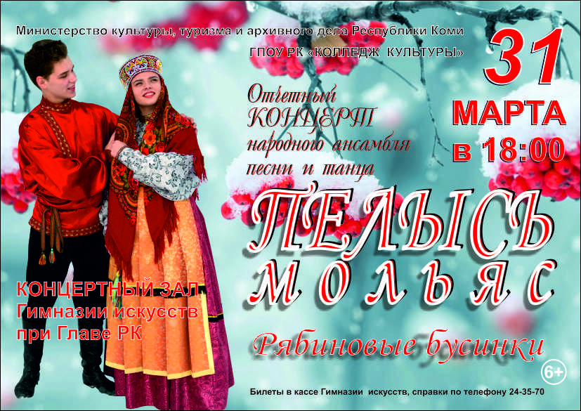 31 марта в Концертном зале Гимназии искусств состоится отчетный концерт Народного ансамбля песни и танца «Пелысь мольяс» (Рябиновые бусинки) (Художественный руководитель – Ольга Просужих, хормейстер Наталья Гнедых, балетмейстер Дмитрий Бушуев, концертмейстеры  Пётр Шучалин, Александр Альхименок, Любовь Глазырина, Николай Артеев)