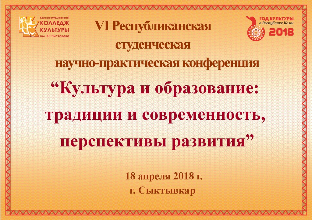 ПРИГЛАШАЕМ ПРИНЯТЬ УЧАСТИЕ ВVI РЕСПУБЛИКАНСКОЙ СТУДЕНЧЕСКОЙ НАУЧНО-ПРАКТИЧЕСКОЙ КОНФЕРЕНЦИИ«КУЛЬТУРА И ОБРАЗОВАНИЕ: ТРАДИЦИИ И СОВРЕМЕННОСТЬ, ПЕРСПЕКТИВЫ РАЗВИТИЯ»Дата проведения Конференции - 18 апреля 2018 годаНаправления исследовательских работ:- Социально-культурная деятельность и библиотековедение: современные проблемы и перспективы развития социокультурной сферы; вопросы экономики и управления; миссия специалиста гуманитарной сферы.- Народное художественное творчество: хореографическое, театральное, этнохудожественное.- Мировая художественная культура: теория и практика.- Искусство, философия, педагогика, психология: пересечения и параллели.- Литература в культуре и образовании.- Современные исследования в области этнографии и фольклора.Условия участияК участию в Конференции приглашаются учащиеся 9-11 классов, студенты средних и высших профессиональных учебных заведений.Форма участия в Конференции – очная (предусматривает присутствие и выступление участника в формате доклада), заочная (для иногородних участников, предполагает стендовое размещение материалов, не участвует в конкурсе).Язык Конференции – русский.Для участия в конференции в срок до 09 апреля 2018 года необходимо направить на электронный адрес организатора :- заявку на участие по установленной форме (Приложение 1);- текст доклада в соответствии с требованиями (Приложение 2).Тексты докладов, не соответствующие установленным требованиям или представленные позже указанного срока, к участию в Конференции не принимаются.Один участник может выступить с любым количеством докладов, вместе с тем, количество авторов одной исследовательской работы не должно превышать 2-х человек, количество руководителей одной исследовательской работы не должно превышать 2-х человек.Регламент устного выступления (доклада) – 7 минут, включая ответы на вопросы. Устное выступление (доклад) может осуществляться с использованием технических средств (мультимедийная презентация, аудио и видео материалы).По результатам работы Конференции определяются победители и призеры, которые будут награждены дипломами, все остальные участники получат сертификат участника Конференции.Тексты докладов будут опубликованы в электронном сборнике на сайте ГПОУ РК «Колледж культуры» в разделе НИРС.Участие в Конференции – бесплатное.Проезд и проживание иногородних участников осуществляется за счет направляющей стороны.Во время работы Конференции для участников и гостей будут проведены мастер-классы. К проведению мастер-классов приглашаются ведущие деятели культуры, педагоги дополнительного образования г. Сыктывкара и Республики Коми, в том числе из числа выпускников ГПОУ РК «Колледж культуры».Знакомство с профессиональной деятельностью успешных выпускников содействует профессионализации всех участников Конференции.Наши координаты:Адрес ГПОУ РК «Колледж культуры»: 167982, Республика Коми,г. Сыктывкар, ул. Ленина, д. 63.Контактное лицо по организационным вопросам:Канова Любовь Феликсовна, заместитель директора по научно-методической работе, (8212) 24 63 32, |