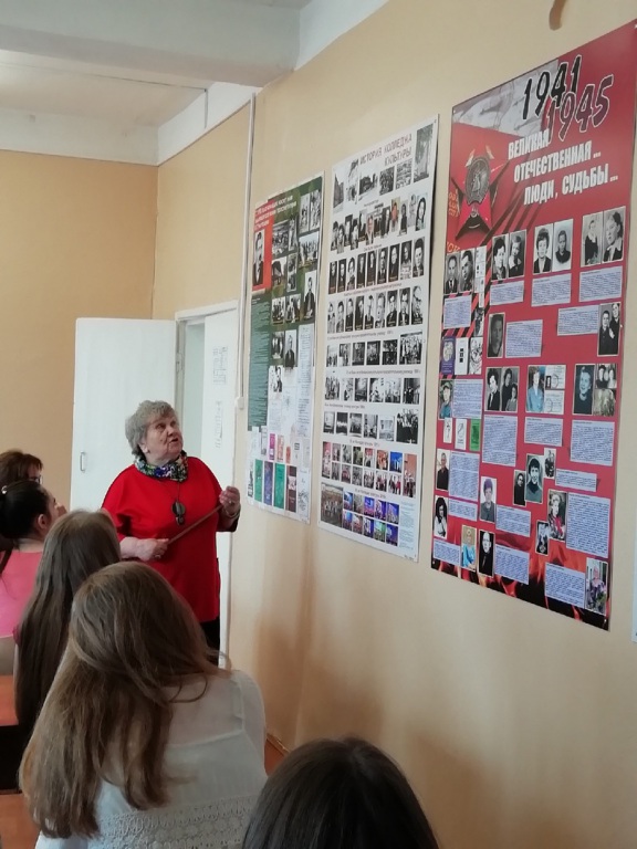 26 апреля - в преддверии Дня Победы - в колледже состоялась ставшая уже традиционной встреча студентов-первокурсников с педагогом-ветераном колледжа, первым заместителем директора культурно-просветительской школы Алевтиной Ивановной Курешовой. Встреча проходила в кабинете-музее истории становления и развития нашего колледжа, в обновлении экспозиций которого Алевтина Ивановна приняла самое активное участие.