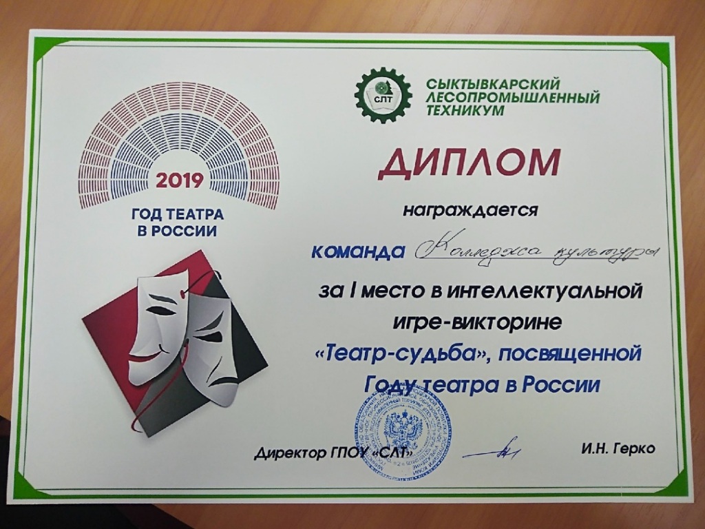 Указом Президента Российской Федерации 2019 год был объявлен в нашей стране Годом театра. С января по ноябрь прошли масштабные международные и всероссийские мероприятия: театральные олимпиады, марафоны, гастроли, премьеры, фестивали, конкурсы, мастер-классы, круглые столы. В течение года студенты Колледжа культуры принимали активное участие в театральной жизни родной республики. Кому, как не студентам Колледжа культуры, быть знатоками этого главного вида зрелищных искусств? И в подтверждение этому 27 ноября студенты специальностей «Театральное творчество» и «Социально-культурная деятельность» Вели Велиев, Артур Забоев, Дмитрий Межевикин и Даниель Дубравин одержали уверенную победу в Интеллектуальной игре-викторине «Театр-судьба».